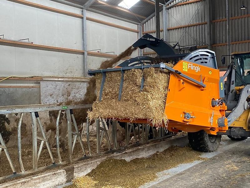 Das Kompakt-Strohgebläse ist ein Einstreugerät, dass das Verteilen vom Stroh um ein Vielfaches erleichtert. Der um 275° drehbare Auswurf vom Typ SHC R ermöglicht schnelles und flexibles Arbeiten. Von der Kabine aus gesteuert, wird das Stroh über die hydraulisch angetriebene Kratzbodenkette der schnell rotierenden Fräswalze zugeführt und über das Gebläse verteilt. Fräswalze und Kratzbodenkette können in der Laufrichtung umgekehrt werden. Die Rückhalter sorgen für eine perfekte Dosierung und verhindert Verstopfung. Die Wurfblätter des Wurfrades sind so geformt, dass sie das Stroh so effizient wie möglich weit werfen, dabei aber so wenig Kraft wie möglich benötigen. Somit sparen Sie Kraftstoff und es staubt weniger.